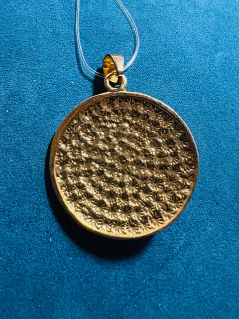 Elle est en métal doré. Avec le temps, ou l’acidité de la peau elle peu finir par devenir argenté… Sa fabrication est artisanal.