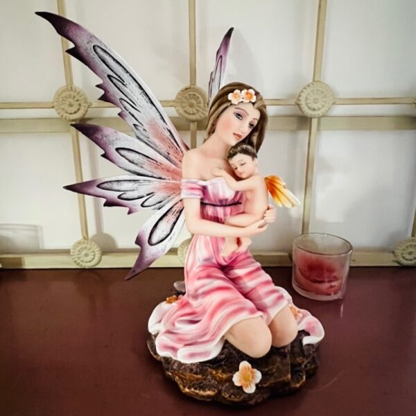 Belle fée toute de rose vêtue, tenant dans ses bras protecteurs son bébé nu, fée en protection et amour !