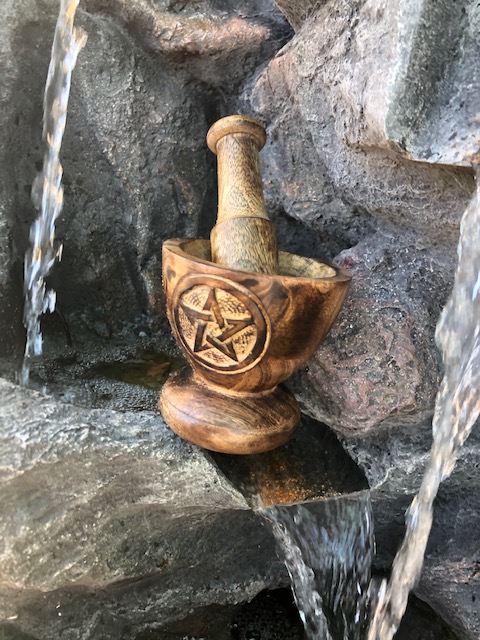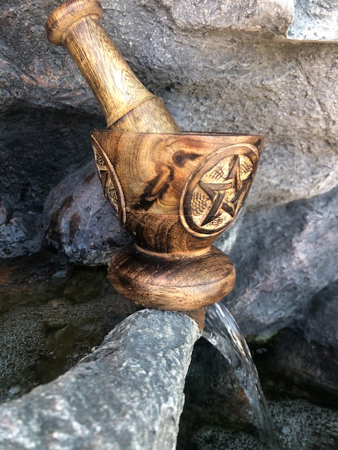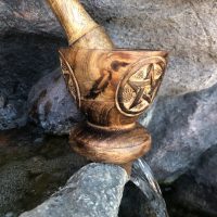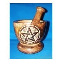Très beau mortier en bois avec son pilon gravé main de 3 pentagrammes.