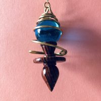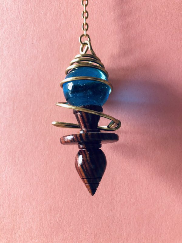 Pendule Célesta : Très vibratoire, ce pendule en Bois exotique, laiton et sphère bleu Murano. Très vibratoire dû au développement de la en Bois exotique, laiton et sphère bleu Murano. Très vibratoire dû au développement de la spirale d’Or. Haute sensibilité pour travailler les corps subtils. Haute sensibilité pour travailler les corps subtils, chakras, méridiens, reiki, points triggers. Pendule pour le thérapeute holistique et magnétiseur.