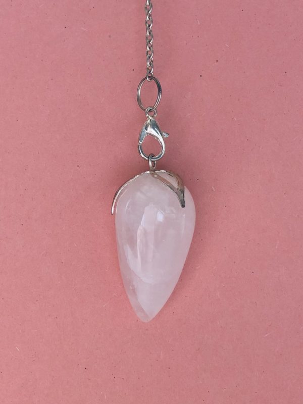 Très beau pendule en métal et pierre naturelle de quartz rose en pointe.