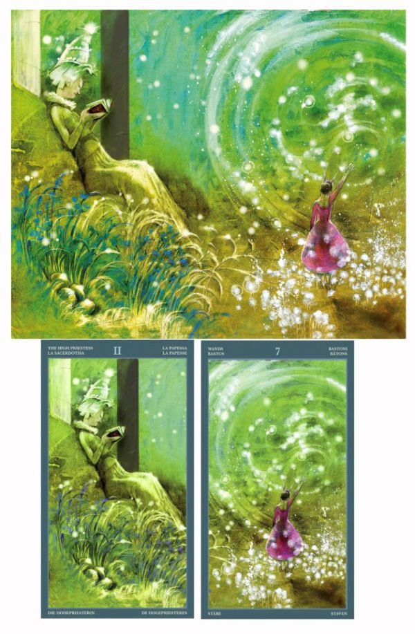 Cette plate-forme fonctionne sur deux niveaux différents, d’abord comme un simple jeu de tarot magnifiquement illustré avec des images de fées inédites ; toutefois si le lecteur combine les deux images jumelles, la lecture atteint un niveau beaucoup plus profond et plus intuitif.