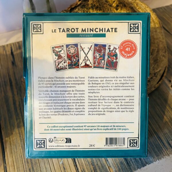 Fidèle au minutieux trait du maître italien, Gaetano, qui donna vie au Minchiate de Bologne en 1763, ce jeu singulier aux couleurs originales ici méticuleusement restaurées ravira les initiés comme les néophytes. Son livre d’accompagnement contient l’histoire détaillée de chaque arcane pour resituer leur lecture dans le contexte culturel de l’époque, un dictionnaire complet de significations, de nombreuses propositions de tirages ainsi que la règle du jeu originale
