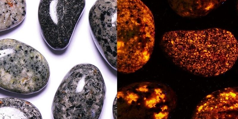 le Yooperlite est son pouvoir luminescent : Lorsqu’elle est exposée à une lumière UV (lumière noire), elle émet une jolie lueur rose, violette, orange ou rouge, selon la variation de l’apatite présente dans la pierre.